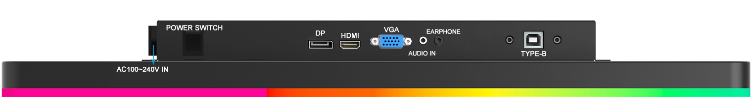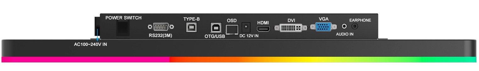 Anschlüsse: Kopfhörer, Audioeingang, VGA, DVI, HDMI, DC-Eingang, OSD, USB Typ B, OTG, RS232 (3M)