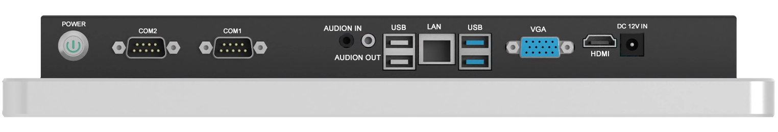 Anschlüsse: HDMI, VGA, COM, Mikrofon, LAN, USB, DCIN, Audio