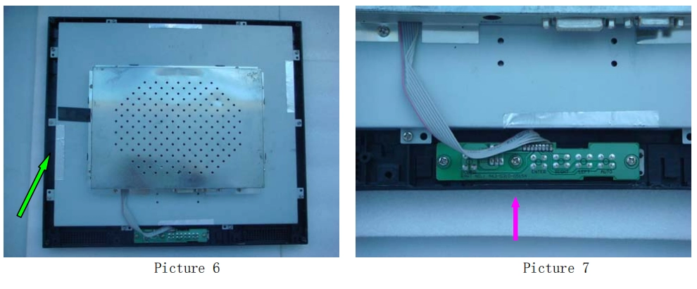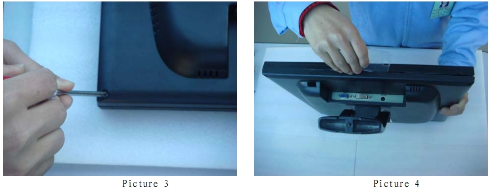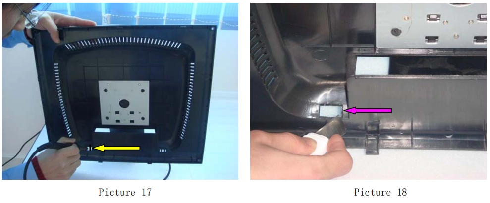 2. Legen Sie den Monitor zunächst mit dem Bildschirm nach unten auf die Perlwolle, damit der LCD-Bildschirm nicht beschädigt wird. Lösen Sie dann die Schrauben auf der Rückseite des Monitors und legen Sie alle Schrauben zusammen an einen Ort, damit wir sie leicht wiederfinden können (siehe Abbildung 3). Öffnen Sie anschließend die Rückseite des Monitors mit einer wertlosen Bankkarte (siehe Abbildungen 4 und 5).