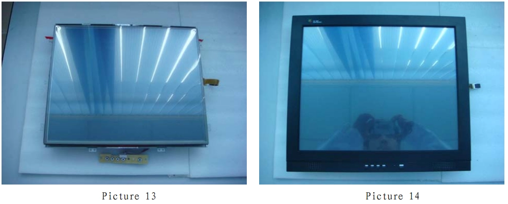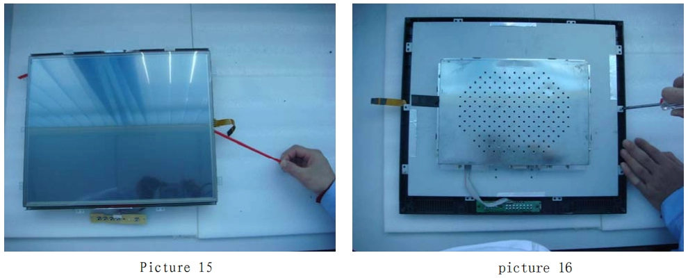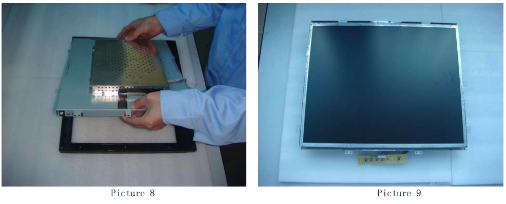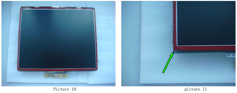 4. Bitte entfernen Sie das LCD-Modul (siehe Abbildung 8) und bewahren Sie es sicher auf (siehe Abbildung 9). Bringen Sie anschließend doppelseitiges Klebeband an den vier Seiten des Monitors an (siehe Abbildung 10). Achten Sie darauf, das Klebeband nicht auf den Touchscreen zu kleben (siehe Abbildung 11).