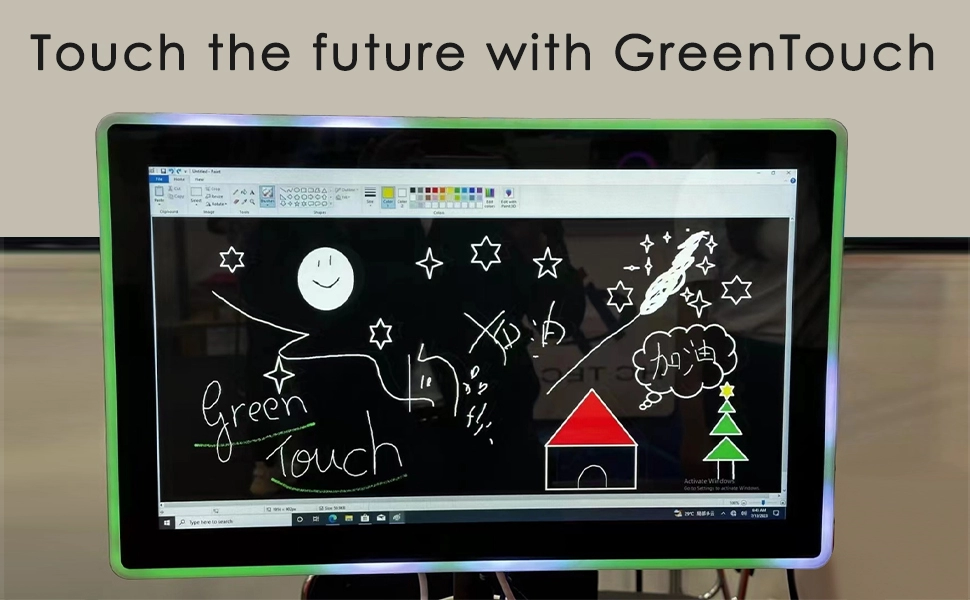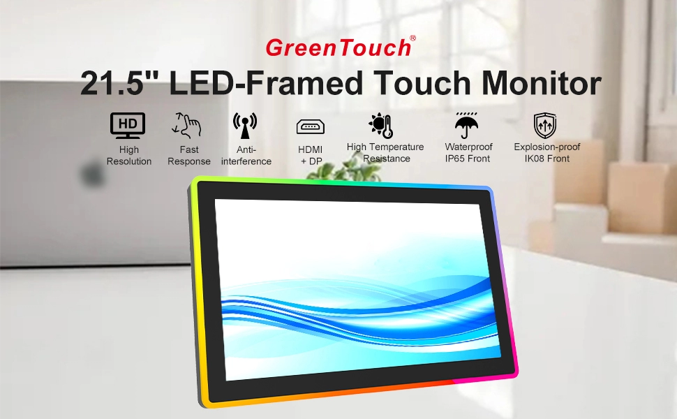 GreenTouch hat einen einzigartigen und leistungsstarken Touchscreen-Monitor entwickelt, der vorwiegend in gewerblichen Bereichen eingesetzt wird. Das Display ist in vier Standardgrößen erhältlich: 21,5", 27", 32" und 43". Der äußere Rand ist mit einem modernen und farbenfrohen LED-Leuchtschild versehen und mit einer Fernbedienung zur LED-Lichtsteuerung ausgestattet. Benutzer können bequem aus verschiedenen RGB-Blinkmodi mit sieben Farben (Rot, Grün, Blau, Weiß, Gelb, Orange, Lila) wählen und 358 verschiedene Lichtmuster einstellen. Zu den Anpassungsmöglichkeiten gehören Farbmischung, Geschwindigkeit, Richtung und Sequenz. Das Display verfügt über ein hochauflösendes TFT-LCD-Display, einen reaktionsschnellen kapazitiven Touchscreen und ein hochwertiges, industrietaugliches LED-Display. Es ist kompatibel mit Windows-, Android- und Linux-Systemen.