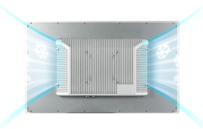 Der GreenTouch Industrial Touch Monitor zeichnet sich durch ein präzises, kleines Rahmendesign aus, das den Touchscreen vollständig abdichtet und ihn so optimal vor Staub, Schmutz und Spritzwasser schützt. Das Produkt vereint die Vorteile stabiler und zuverlässiger Leistung in Industriequalität mit einem modernen und praktischen Design. Die Rückseite des Gehäuses verfügt über ein Lamellen-Kühlsystem zur Vergrößerung der Wärmeableitungsfläche.